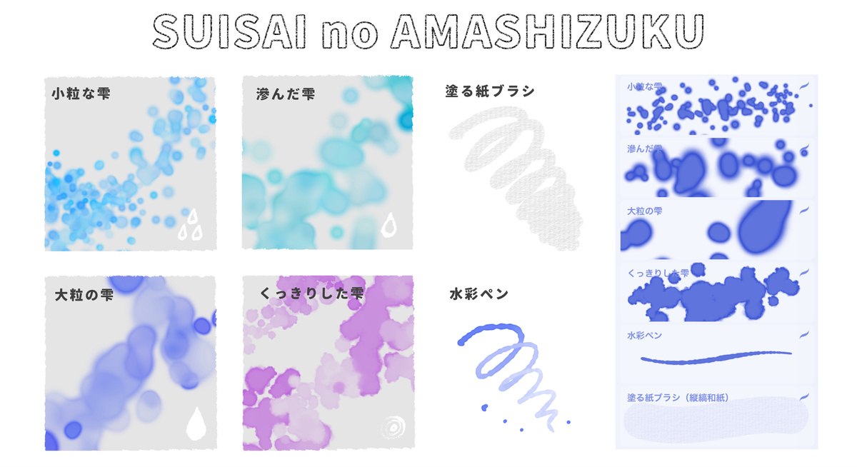 我将提供一个可安装并在Procreate中使用的自定义画笔,名为『水彩的雨滴』。这是一个随机撒播水滴的画笔,可以广泛用于插图的背景,或者作为纺织品设计等。请在iPad应用程序的版本5.1或更高版本中使用。